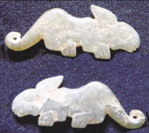 陕西一藏家收藏一件西周时期的玉兔,玉兔呈匍匐状,体长约4厘米。兔子双面工,图片显示的是玉兔的正反两面。玉兔长耳,管钻眼,臀部隆起,长尾卷曲,四肢蜷曲,脚趾用阴刻方法表现出。这件玉兔与以前曾介绍过的西周玉兔体态略有不同,而且玉质本身钙化较为严重。