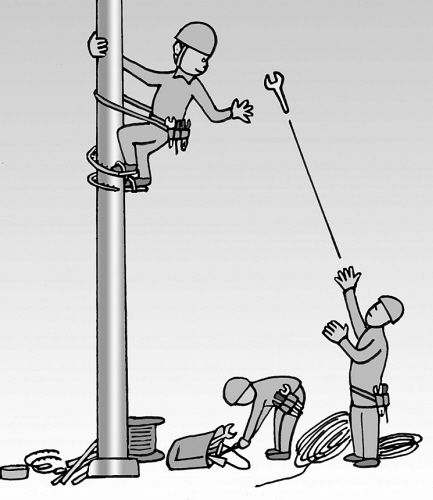 有个杂技叫空中飞人,表演者在空中飞来飞去,表演各种惊险动作。在我们工作中也有一些工人喜欢表演,在传递工具时抛来抛去,经常造成伤人事故。我们传递工具时应讲配合,讲稳妥,该用包装用包装,该用绳索用绳索,毕竟工作不是表演杂技。(田草 编绘)