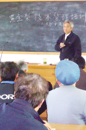日前,在河南省社旗县李店镇狮子庄村党支部,果农们正在聚精会神的学习黄金梨的生产管理技术。该村是社旗县“黄金梨生产基地”,为了突破制约果树增产的技术“瓶颈”,农民们在自发成立“林果协会”的基础上,又利用冬闲季节,聘请科技局林果专家为果树生产顾问,负责指导果树修剪、科学管理等生产技术。 宋同杰 摄