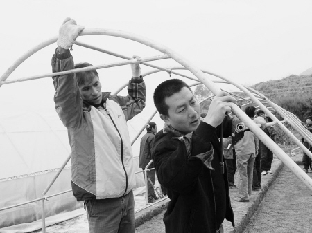 隆冬时节,四川省宁南县烟区到处呈现出繁忙的播种育苗景象。该县烟草专卖局(营销部)170余名烟叶生产技术员分赴千家万户,指导烟农积极开展育苗工作。图为烟叶生产技术员正在指导烟农组装育苗钢架大棚。 李坤忠 摄