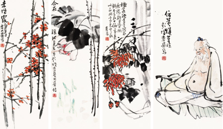 李可染创作于1925年的《花卉人物四条屏》有可能是作者现存的最早期作品,时年李可染仅18岁。据委托人回忆,1993年,其曾有机会在徐州得见此作,并有幸购之。1995年,该作品发表于《收藏家》杂志总第12期,并有专家为此撰写评论。李可染于1925年回徐州任第七师范附小和徐州艺专图画教师,《花卉人物四条屏》即是创作于回到家乡之时。四条屏中,三条为花卉,一条为人物,看起来似乎有点不协调,因此,“仿黄慎笔意”的人物疑为后补作品。徐悲鸿先生曾经多次为李可染画展写序,载于1947年9月12日天津《益世报》的《李可染先生画展序》称:“芒砀丰沛之间,古多奇士……徐州李可染先生,尤于绘画上独标新韵,徐天池之放浪纵横于木石群卉间者,李君悉置诸人物之上,奇趣洋溢,不可一世,笔歌墨舞,遂罕先例,……世之向慕瘿瓢者,于此应感饱啖荔枝之乐也。” 瘿瓢,即黄慎,清代著名画家。由此可看出徐悲鸿对李可染的看重以及对他人物画的高度评价。