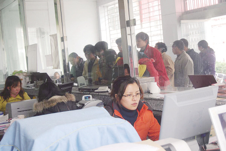 近日,湖南宁远县农信联社的清水桥信用社,临柜人员增开了服务窗口,以加快速度为客户解决排队问题。冯勤友/摄
