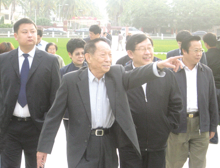 近日,全国政协副主席、科技部部长万钢(前排右二)在中国工程院院士、杂交水稻之父袁隆平(前排右三)和史丹利化肥股份有限公司总经理高进华(前排左一)的陪同下参观海南三亚超级水稻试验田基地。苏华 摄