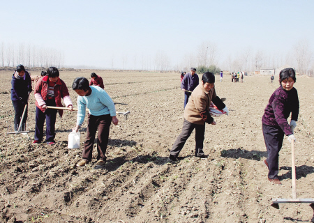 近年来,连云港灌云县南岗乡在农业结构调整中,注重发展前景好、农民收入增加快的特色种植养殖业,目前该乡的花卉苗木基地、中药材基地、肉鸡养殖基地已初见雏形。图为连云港灌云县南岗乡农民正在中药材基地播种白芍药。道勇 江伦尧 摄