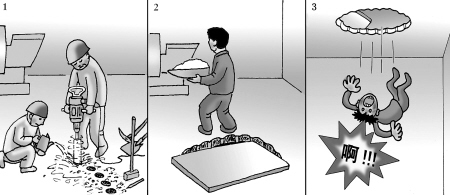 1、2007年7月,某饲料厂在厂房安装设备时,施工队在二楼楼面打开一个直径约0.8米的孔洞。下班时,工人随手用一块盛料的木托盘盖上孔洞便离去。
