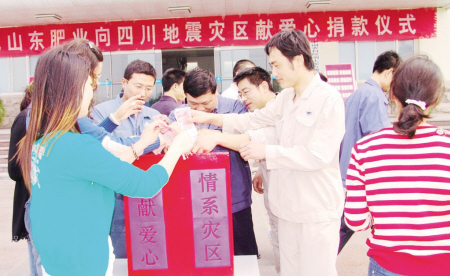 5月16日上午,中化山东肥业有限公司员工踊跃为灾区人民捐款献爱心,公司500多名员工慷慨解囊,短短一上午的时间便为灾区捐款7万余元。