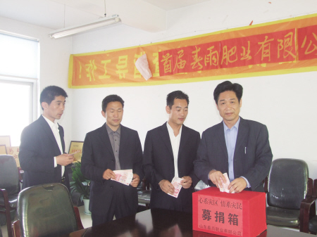 在得知四川发生强烈地震后,山东春雨肥业自发成立了捐款流动站,第一天收到员工捐款3万余元。图为后勤人员捐款现场。
