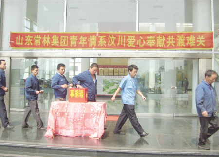 为帮助灾区同胞渡过难关,山东常林肥业有限公司积极号召全体职工开展“情系汶川、爱心奉献“爱心捐助活动。截止到5月19日常林肥业公司共收到捐款 11万余元,向灾区人员献出一份爱心。