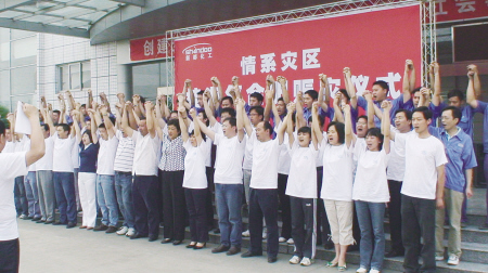 在捐赠仪式上,邦力达彭州农资公司代表彭州所有的受灾农民向新都化工表达了深深的谢意,他还说永远无法忘记灾后第一时间新都化工为他们公司及下属的二级经销商送去的现金和慰问品,及时解决了很多人的生活问题,“患难见真情”,他们将永远铭记这份恩情。捐赠仪式的最后,在场的新化人和受捐的客户代表一起双手相挽并高举头顶,“抗灾自救,我们一起努力”的口号传递出新都化工和灾区同行并进的决心。