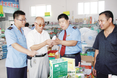 日前,山东禹城市工商局张庄工商所深入开展“红盾护农”行动,强化对种子、化肥、农药等农资市场的监管,加强日常巡查,开展多种形式的农资科普宣传讲座,提高农民辨识优劣农资能力,严厉打击制售假冒伪劣农资坑农害农行为,有力地保证了当地农资市场安全和谐。图为该所所长李永华带领所里的职工深入农资经销店进行抽查农资质量。