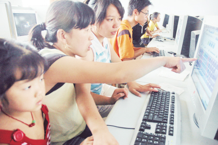 八月四日,河南省社旗县唐庄乡岗里村三十二岁的李明锐(左二)带着三岁的女儿学习计算机实用技术。去年三月,李明锐前往广州打工,看到“技术蓝领”走俏吃香后,毅然返回家乡,参加县里举办的“阳光工程”农民工免费技能培训。