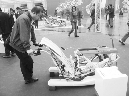 11月1日,第七届中国(武汉)国际农业机械展览会暨全国农机新产品交流订货会在武汉国际会展中心开幕。日本井关、日本久保田、韩国东洋、上海纽荷兰、福田雷沃、中国一拖、常州东风、约翰迪尔、常州常发、江苏沃得、江苏清拖、武汉黄鹤等近200家国内外知名农机企业参加展览。展会特别邀请了3700名农机大户、农机合作组织、农机科技示范户代表作为专业观众参加。武汉市拿出80万元资金用于农民现场购机补贴,有14家农机企业在展会上签约,签约金额达5亿元。图为收割机。 中新社传真 孙新明 摄(cnsphoto供图)