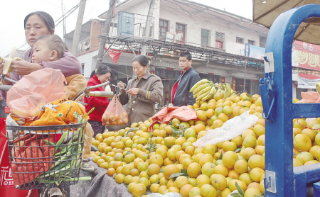 11月8日,河南省社旗县下洼乡农民在农村大集上购买柑橘。受四川省广元市旺苍县柑橘大实蝇虫害影响,前不久,各地柑橘的价格、成交量、市场份额一度下降。经各级农业部门采取积极应对措施以及专家辟谣后,消费者信心逐渐恢复,柑橘市场开始回暖,柑橘批发价格上扬,市场交易量逐渐恢复。 宋同杰 摄