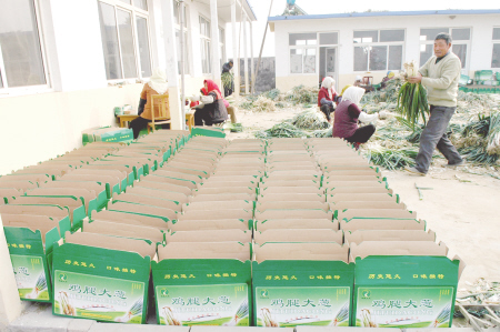2008年12月10日,在山东省日照市东港区两城镇安家岭村村委大院,安家岭鸡腿大葱专业合作社的成员在加工“鸡腿大葱”,准备运往青岛市的超市销售。
