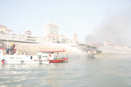 12月17日下午3时许,广西梧州西江一货船突然起火,货船机舱内存有一吨柴油,随时有爆炸的可能。梧州水上消防中队10名官兵迅速出警,经过30分钟的扑救,大火被扑灭。据了解,该货轮隶属梧州长洲水运,事发时船主已上岸购物,无人员伤亡。