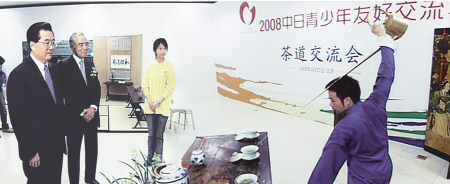 3月15日,国家主席胡锦涛在北京出席“中日青少年友好交流年”开幕活动。在观看了两国青少年书法表演后,胡锦涛主席又来到中日青少年表演茶艺和茶道的茶室,观看表演后,寄语两国青少年:“以茶为缘,以和为贵”。