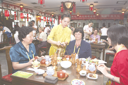 我永远记得8月5日那一天,罗格夫人二次光临老舍茶馆,和她一同到来的还有30位奥组委委员夫人。我被安排教坐在第一排中间一桌的贵宾泡茶,随着主持人的一声“有请我们的茶艺师上场”,我怀着忐忑的心情走出来,当在我负责的桌位前站定后……简直不敢相信自己的眼睛,坐在我面前的居然是罗格夫人!虽然我为很多客人泡过茶,但是当面对罗格夫人时,依旧感到紧张和兴奋,生怕出现一丝差错。