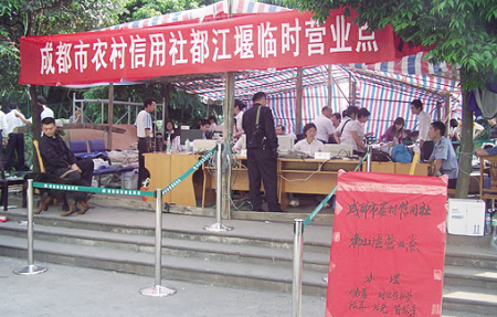 地震过后,都江堰农村信用社很快设立了临时营业点,被市民称为“帐篷银行”。