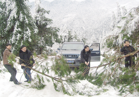 雪灾过后,贵州省联社黔东南办事处综合部经理唐永贤、雷山联社副主任文尔达等在雷公山上排除路障前往方祥乡勘察灾情。