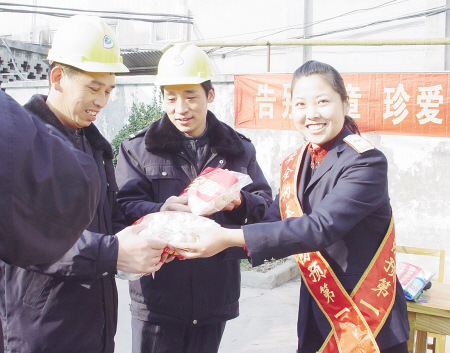 2008年12月31日,安徽淮北矿业铁运处烈山电务段的机电工们吃上了工会慰问队送来的“安全”饺子。从2008年12月30日到新年元月3日,铁运处工会组织了20多名慰问队员进行了为期5天的“安全饺子送岗位”活动。慰问队员把一袋袋饺子贴上安全标语,送到基层车站、养路区,送到坚守岗位、保障铁路煤炭安全运输的一线职工手中。  孟德强 王红梅 摄