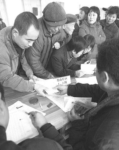 图为2008年底,苏州市吴中区横泾街道尧南社区的农民在社区分红现场领取今年的股份分红。