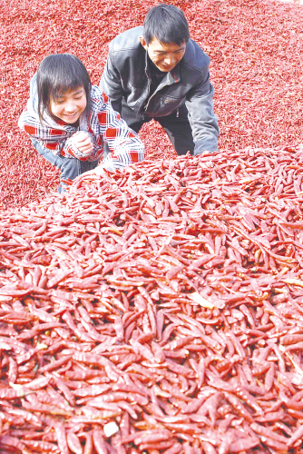 近日,山西临汾山樱椒产销集散地襄汾县赵康镇许多村的农家大院、专业合作社、购销市场内,上万名椒农和经纪人及来自全国各地的采购商忙活着挑拣、收购、装袋、装车山樱椒。当地农民调产种、收、销山樱椒不仅加快致富,山樱椒也成为当地农民和新农村建设的形象代言农产品而名扬三晋,俏销全国。图为山西临汾襄汾县赵康镇赵雄村一椒农和外甥女在挑拣山樱椒。 高新生 摄