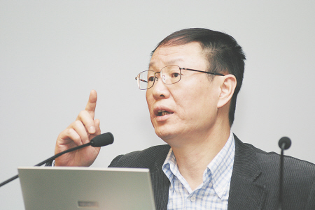 中国社会科学院财政与贸易经济研究所所长裴长洪(上)、国家发改委宏观经济研究院副院长王一鸣(下),到会作国际与国内经济形势专题报告。