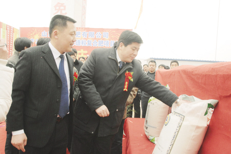 近日,在山东富土化肥年产三十万吨高塔熔体造粒复合肥项目投产仪式上,临沭县委书记孙丰刚(右一)在山东富士化肥有限公司总经理吴绍山(左一)的陪同下参观富士化肥公司产品展示。