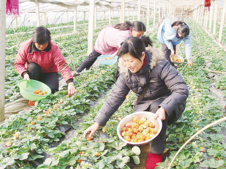 近日,江苏省东海县黄川镇新沭村草莓种植户正在采摘成熟的草莓。眼下,该镇运用温室科学种植的反季节草莓进入采摘期,草莓基地内是鲜果飘香,备受市民青睐,据了解,该镇发展草莓面积已达到两万五千亩,年产鲜果四万吨,为民带来经济收入近三亿元。 张开虎 王 艳 摄