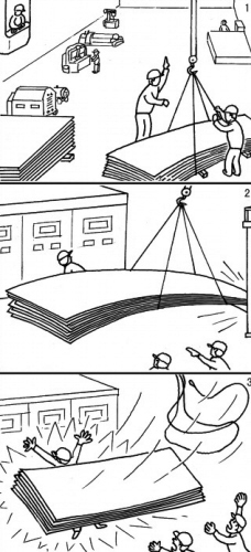 严格执行起重作业的安全操作规程,吊物捆绑后必须认真检查,确认安全牢固后方可起吊,吊较长的大型物体应高于地面设备,以免行驶过程中发生碰撞,吊物下严禁有人。(苗 杰编绘)