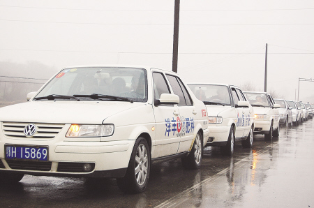 二月二日上午,洋丰销售“铁军”在细雨中整装待发。两百多辆洋丰宣传车排列在公路边,它们将载着洋丰四百多名业务员奔赴全国各地,为实现二〇〇九年“实现销售收入四十五亿元”的经营目标开始努力。 刘 斌 摄