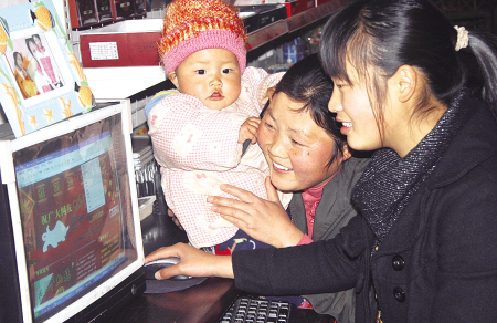 农历大年初一,湖南省邵阳县下花桥镇三合村女青年刘静(右一)在自家上网给亲友拜年遥祝新春。新年前夕,邵阳县最后十个边远村开通了宽带网络,全县宽带网络村村通,电信宽带网用户达八千户。便利通信成为农家网上拜年的时尚。