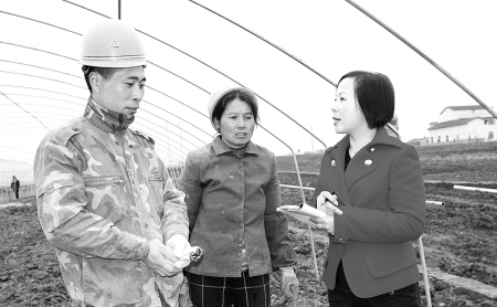 在全国人大、政协会议召开前夕,全国人大代表唐燕子(右一)在四川广安市观塘镇煤坪村现代农业示范基地向正在劳作的农民了解“三农”情况。以便把广大农民群众的心声和意愿带到在北京召开的人代会上。