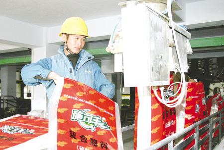 眼下临近春耕用肥季节,农民的用肥观念也在悄悄变化,高科技产品备受青睐。施可丰公司全体员工正加班加点,开足马力,力争多产优质肥料支援春耕生产。图为工人正在包装复合肥。 刘建国 摄