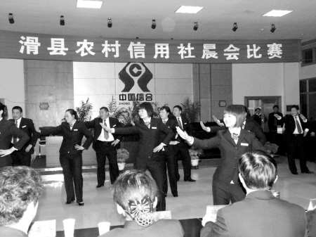 近日,河南省滑县农信社为了进一步深入开展规范化服务工作,在全县农信社开展了“规范化服务月”竞赛活动。图为汇通信用社在比赛场上精彩表演。谢利光 摄