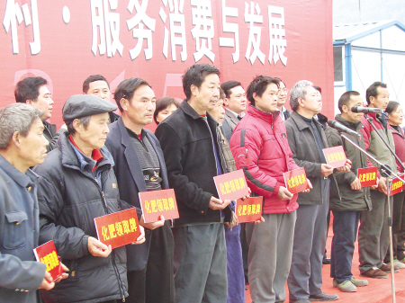 活动最后,由成都市工商局等参会领导为崇州市街子镇二十余户贫困农户颁发了企业捐赠的肥料,解决了他们春耕用肥的燃眉之急,此外公司联合当地经销商出台了销售让利活动,凡是在活动期间购买肥料的农民均可享受远低于市场价格的优惠,让广大灾区群众得到了实实在在的优惠,为后续生产提供了保障。