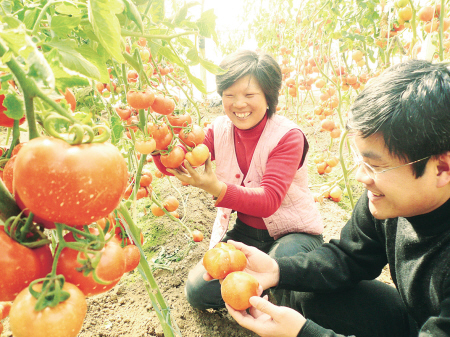 图为东海县白塔埠镇科技人员正在向菜农讲解以色列FA-189西红柿沼液滴灌情况。
