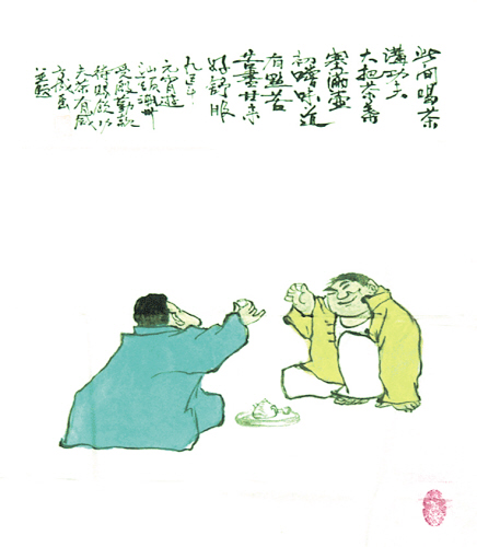 上面这首打油诗是方成1991年在汕头、潮州两地过元宵节,品尝功夫茶后,留在漫画《功夫茶》上的题画诗。《功夫茶》画面是两位潮汕老汉,席地对坐,两人举杯对品,中间为功夫茶具。线条简练,右边男人笑容可掬,是品茗之后的会心之笑,颇为传神。