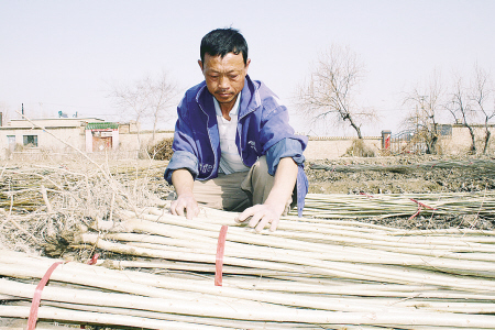 3月29日,新疆生产建设兵团农五师89团种植苗圃的农民吴新华正忙着销售用于“三北”林建设的树苗。今年,吴新华的10亩苗圃地可以生产树苗10万多株,纯收入可达2万多元。像吴新华一样,89团的10多个苗圃种植户们都在忙着销售树苗,国家实施的“三北”生态防护林建设工程,让这些农民靠种植用于生态建设的树苗致了富。