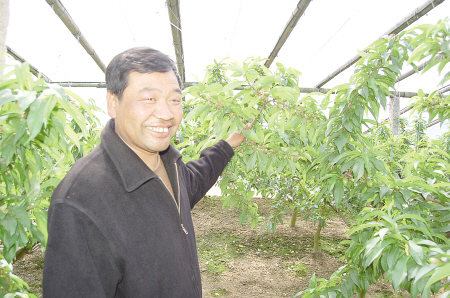 王竹森种了20多年的桃树,96年开始大棚种植,目前有5个棚的油桃。当记者走进他的油桃大棚时,长势良好的桃树上硕果累累,虽然还未到成熟时节,偶尔还有几个桃子上微微泛红,王竹森指着挂满桃子的桃树,脸上露出了自信的微笑。
