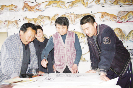 今年六十岁的王德民是山东郯城县郯城镇一位普通农民,从小就喜欢写字作画。从今年元月开始,王德民就开始创作《百虎图》,现已绘就六十八只,计划在庆祝建国六十周年前完成,以一个农民的身份向祖国献礼,祝愿祖国如虎添翼,虎虎生威,繁荣昌盛。