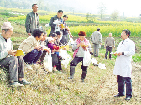 九禾股份有限公司依托测土配方施肥生产基地,组织专业人员深入各地农村向农民推广测土配方施肥技术,提供土壤普查、测土配肥等服务。图为该公司技术人员在重庆市云阳县栖霞乡为农民讲解测土配方施肥技术知识。