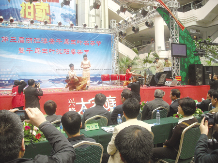 近日,浙江省淳安县茶叶行业协会在当地政府领导的带领下,远赴沈阳,以第三届浙江淳安千岛玉叶奉茶节打开东北市场。经销商座谈会上,淳安县领导与东北茶商对绿茶推介进行了交流。吉林省经销商孟经理说,如果浙江绿茶能考虑东北消费者的饮茶习惯,制成花香茶会更受欢迎。图为奉茶节开幕式现场。赵忠武 摄