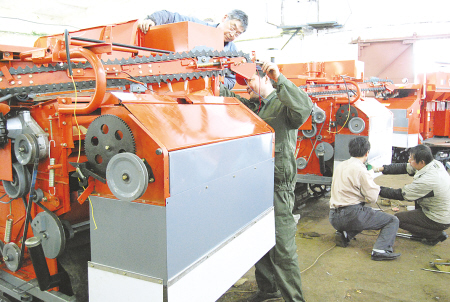 4月16日,江苏省南通富来威农业机械装备有限公司通州工厂员工正在加紧整装急发的收割机。该公司通州工厂研发的浦口4LB-1450型半喂入自走式联合收割机获农业部、江苏省“农业机械推广许可证”,并入选《全国通用类农业机械购置补贴产品目录》。