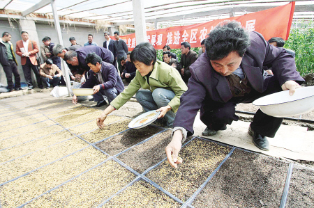 4月17日,连云港市新浦区农林水利局技术人员正在进行水稻反季节软盘育秧。为了提高农机化作业程度,当天,连云港市新浦区农林水利局在浦南镇草舍村开展水稻反季节育秧技术推广活动,吸引了众多农民到场观摩、学习。 穆道勇 赵东华 摄