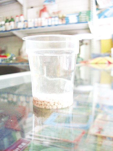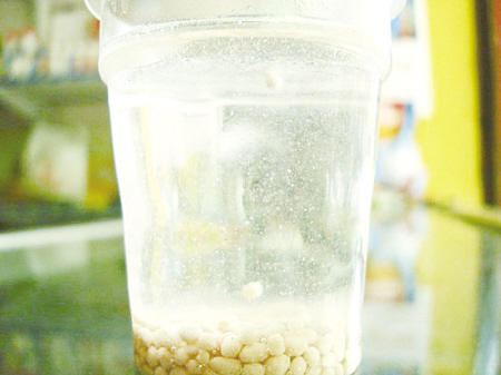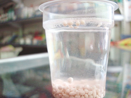 在京山县采访时,本报记者在许明磊的店中抽取了“澳特尔”30%氯基复合肥样品放入盛有纯净水的杯中,做了一次试验,并用相机记录下眼前所发生的一切。