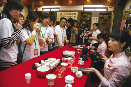 活动中,尹智君总经理还向高校学子宣布了老舍茶馆实施高校推广活动三大举措。从2009年开始,每年四月的最后一周定为“老舍茶馆高校茶文化周”;面向北京举办“各大高校关于传统文化有奖征文活动”;即日起设立老舍茶馆专项基金,资助高校学生的传统文化实践活动。尹智君总经理表示,为了更好地发挥国家级文化产业示范基地的示范、辐射及带动作用,伴随此次茶文化节活动的开展,老舍茶馆还将常年不定期地接纳各大院校的学生及茶文化爱好者,为大学生们长期提供传统文化学习实践的平台。