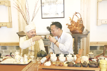 “160年前,罗伯特·福琼从武夷山带走了茶种和茶苗,红茶西游印度,从此喜马拉雅山脚下出现了大片的茶园。今天,印度茶商带着印度的红茶东渡,来到武夷山,把它带回给中国。”前不久,应央视《走遍中国》节目组的邀请,56岁的印度罗禅茶叶公司总经理罗禅来到红茶发源地武夷山桐木村寻祖。拍摄间隙,正山小种企业负责人江元勋与罗禅(左)共同品尝了正山小种新品。邱汝泉 摄