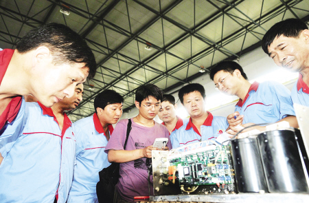 安徽淮北矿业孙疃矿把生产中的技术难点和研发重点分解到班组、解决在班组,在全矿开展“比、学、赶、帮、超”学优评先活动,提高了基层班组技术创新热情,今年以来,基层班组独立完成的技改项目占全矿科技研发课题总数的60%以上。图为:9月3日,该矿机修厂技术攻关小组在对矿用煤机变频器控制系统进行优化测试。刘玉保 摄