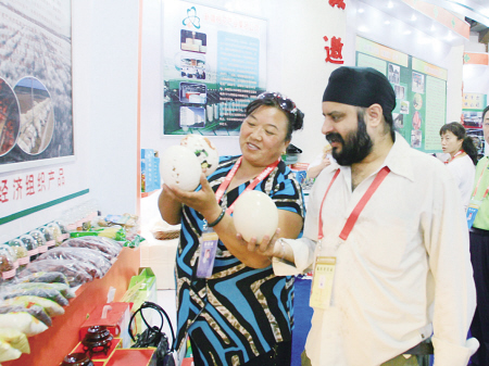 展台上,10多枚硕大光亮的鸵鸟蛋分外引人注目,有的还雕刻了精美的图案,一位中亚客商爱不释手。鸵鸟蛋是新疆呼图壁县大丰鸵鸟养殖协会生产的,协会秘书长铁步花介绍,她2002年开始购得6只雏鸟饲养,现在已达到40只的规模。昌吉州供销合作社去年将她的鸵鸟蛋首次摆上了乌洽会,扩大了在国内外的销路,年收益达到15万元。不仅如此,去年州供销合作社还奖励她5000元,并组织她参加经纪人市场培训班,开阔了她的经营思路。铁步花对鸵鸟蛋进行工艺加工,在上面绘画、雕刻、景泰蓝上色,经过加工的鸵鸟蛋一枚能卖到800元,很是畅销。铁步花说她从心底里感谢供销合作社的支持,现在她们村鸵鸟养殖户已经发展到5家,养殖数量达到270只,她计划带头成立鸵鸟专业合作社,与更多村民共同致富。